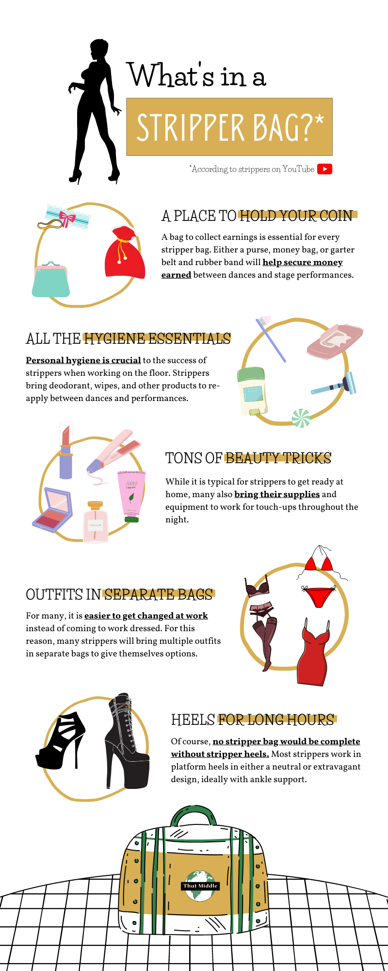 According to the countless videos from the “What’s in my stripper bag” tag on YouTube, there is a general consistency to what is recommended to buy and bring to set yourself up for a successful night at the club.